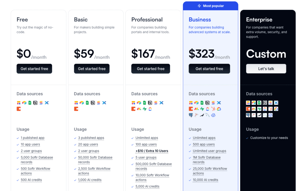 Softr pricing starts at $0/month for the Free plan (up to 10 users), then $49/month billed annually for Basic (25 users, custom domains), $139/month for Professional (50 users), and $269/month for Business (500 users). There’s also a custom Enterprise plan for larger organizations.