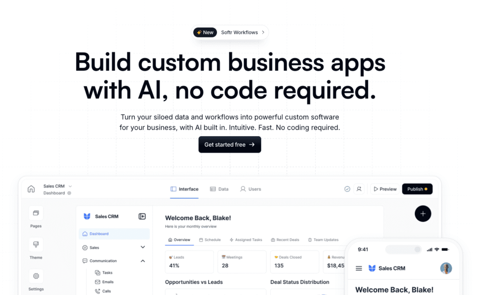 Softr’s feature set has grown remarkably, and it’s now a full-stack AI platform where you can build databases, apps, workflows, and forms to power internal tools, portals, and full operational systems without writing code. We built a full CRM with lead tracking, a meeting scheduler synced to Google Calendar, deal pipelines with status updates, and revenue dashboards pulling real-time Airtable data. All this in under 2 hours, without writing code.